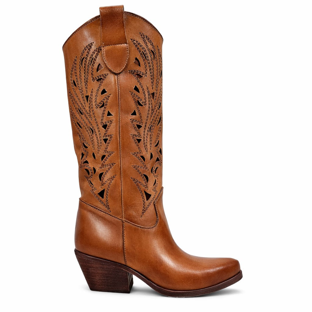 Il modello Colorado è realizzato in morbida pelle color cognac e si distingue per la raffinata lavorazione traforata e ricamata sulla tomaia, che richiama l’estetica dei classici stivali western reinterpretandola in chiave elegante e femminile.