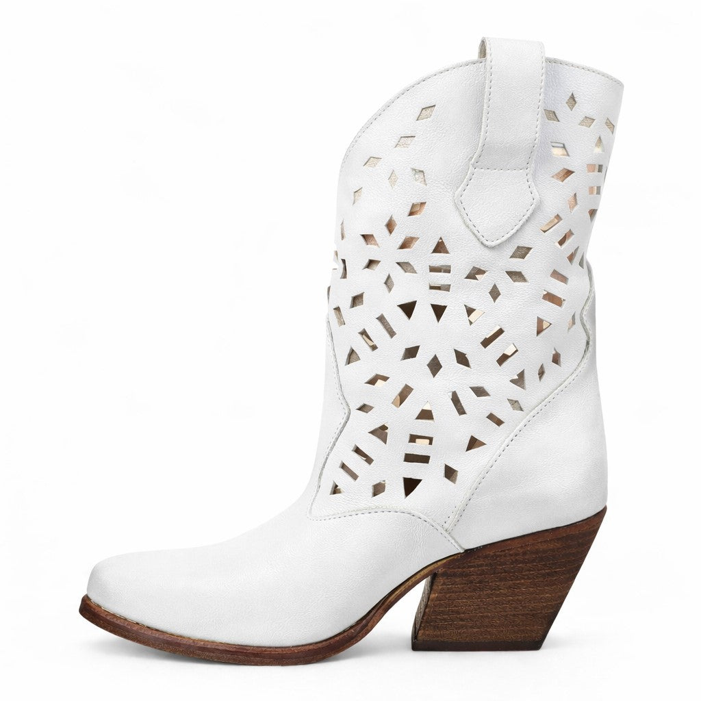 Il modello California è realizzato in morbido pelle color bianco e si distingue per la particolare lavorazione traforata, che crea un disegno geometrico leggero e armonioso sulla tomaia. Un dettaglio ricercato che dona personalità allo stivale mantenendo un’eleganza naturale.