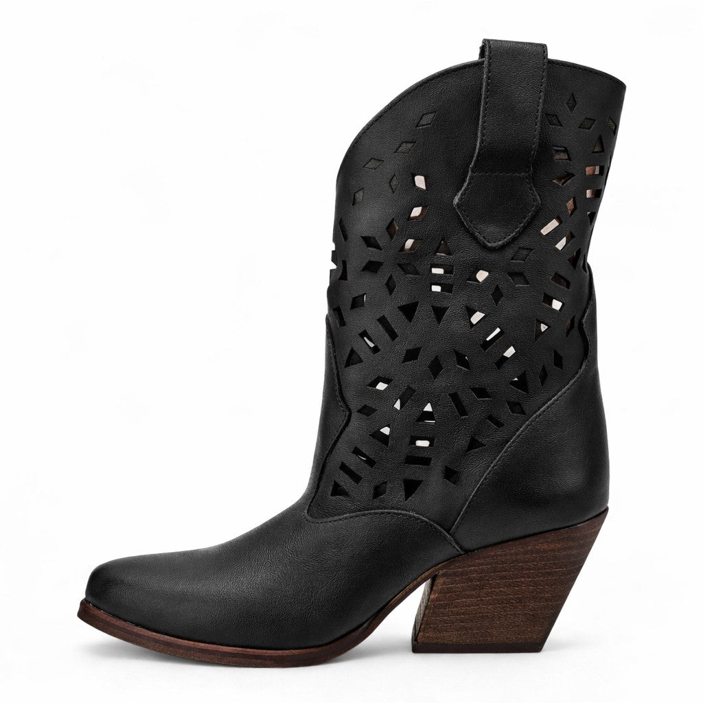 Il modello California è realizzato in morbido pelle color nero e si distingue per la particolare lavorazione traforata, che crea un disegno geometrico leggero e armonioso sulla tomaia. Un dettaglio ricercato che dona personalità allo stivale mantenendo un’eleganza naturale.