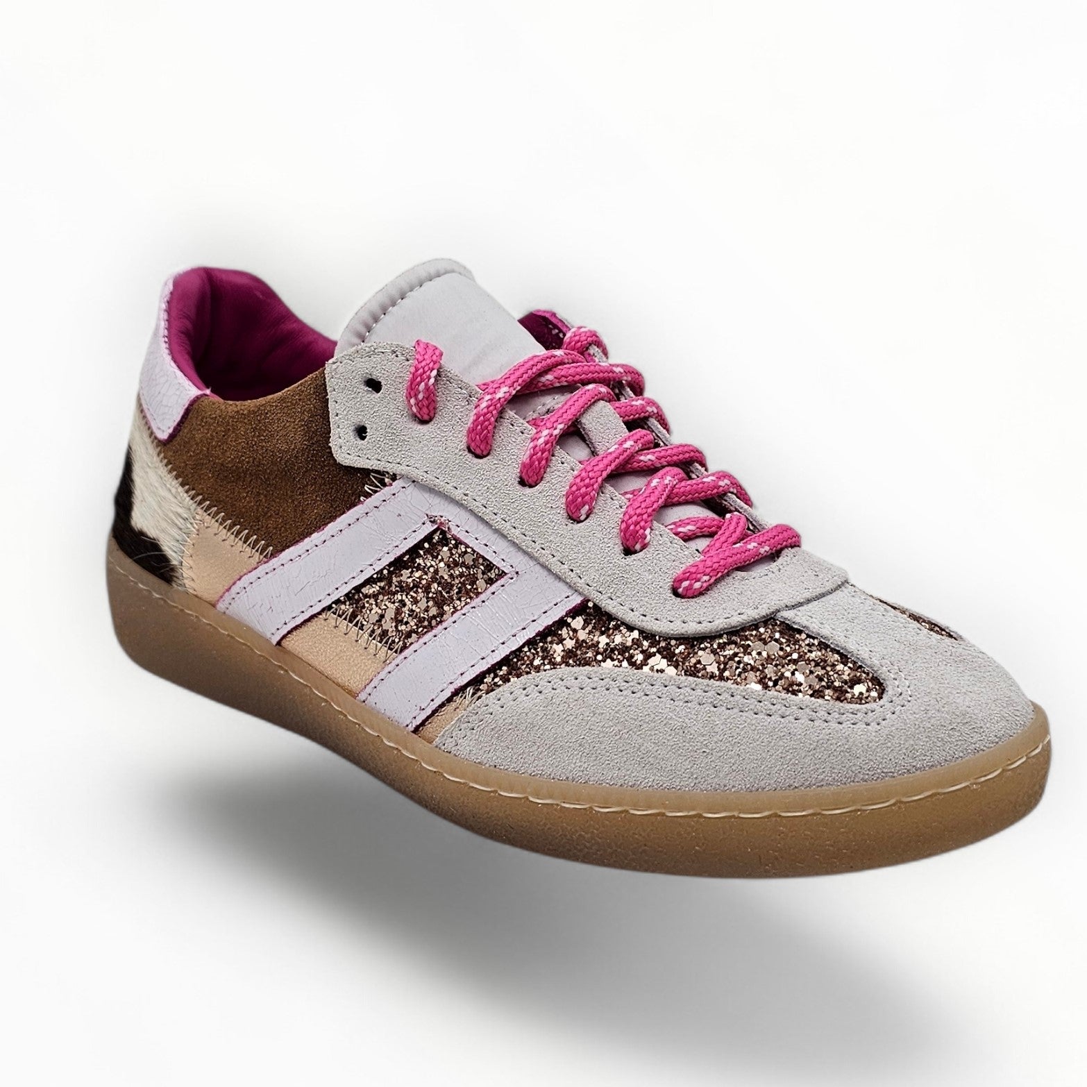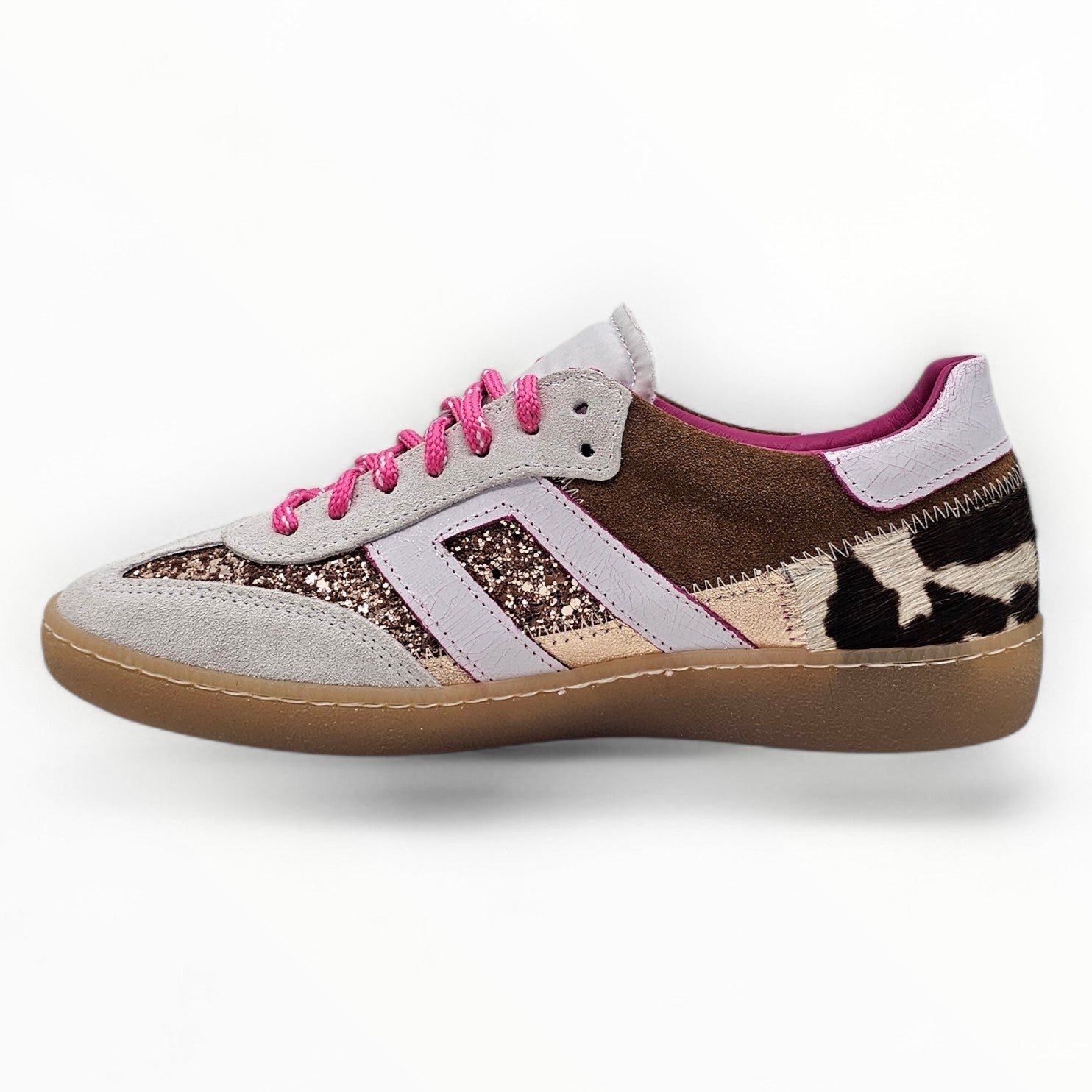 Tomaia: camoscio ed patch in cavallino e glitter