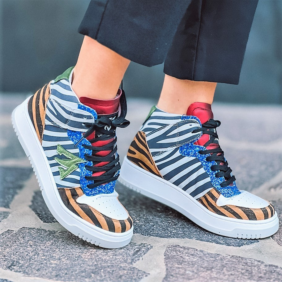 Tomaia: nappa vera pelle con particolari in maculato e zebrato
