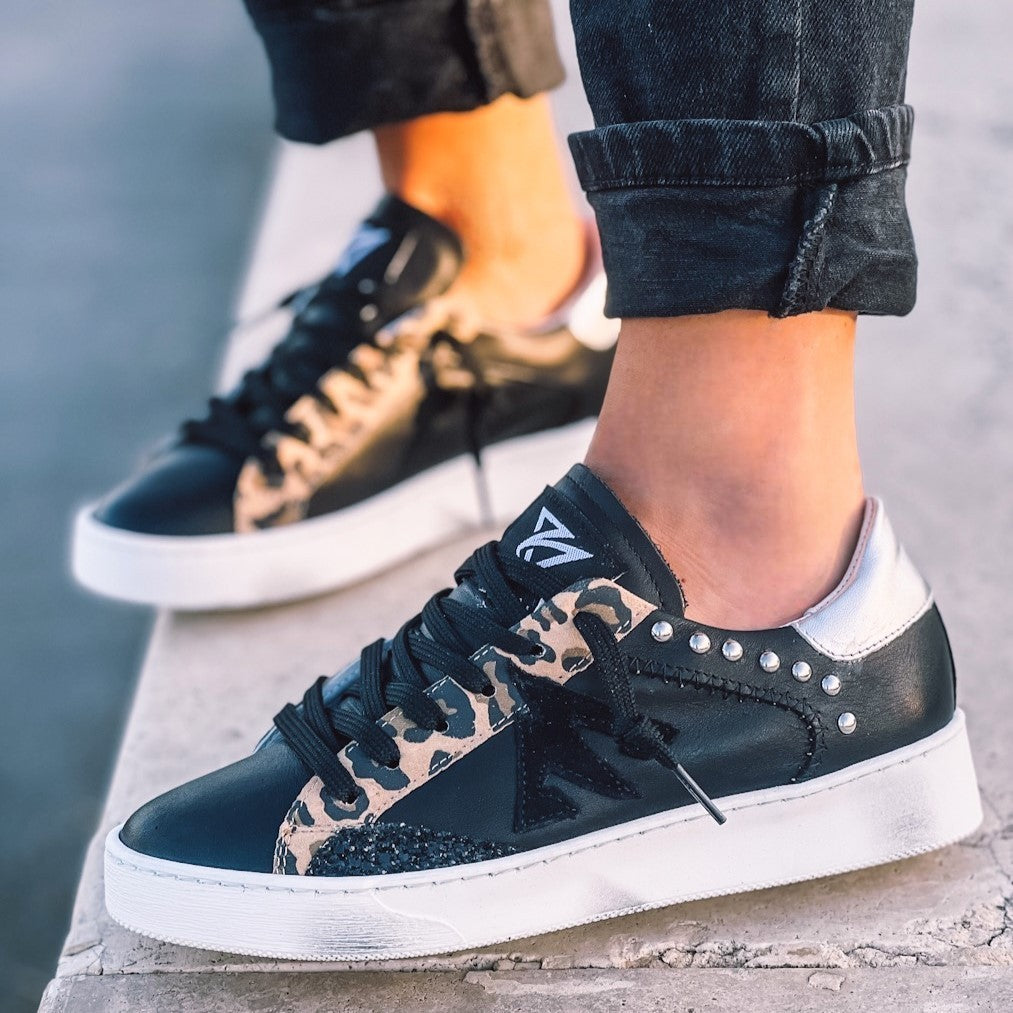 Tomaia: nappa vera pelle con particolari in maculato ed applicazione borchie