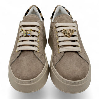 Sneakers con suola platform dal design contemporaneo. La suola, alta 5 cm nella parte posteriore, offre comfort e slancio alla figura. Soletta interna estraibile. Ogni modello è arricchito da accessori gioiello applicati sui lacci, che donano un tocco di eleganza e unicità.