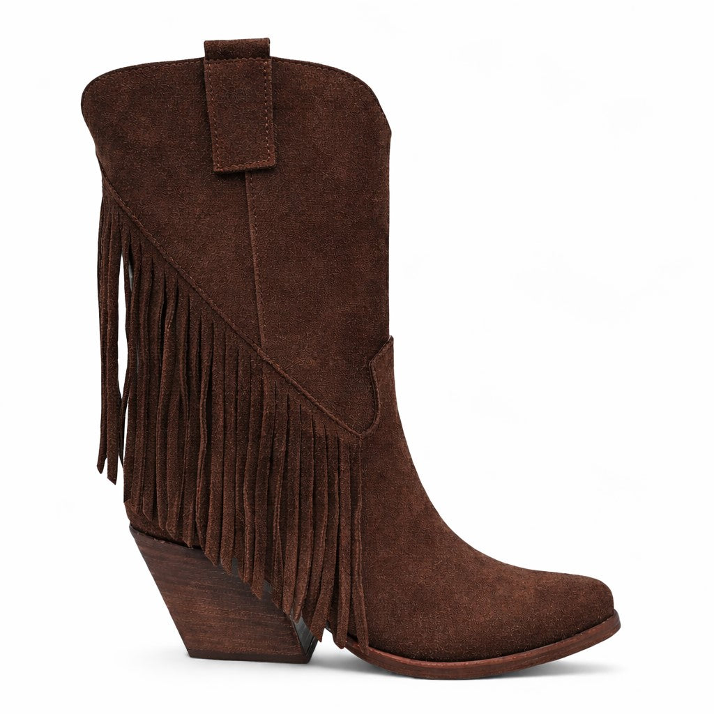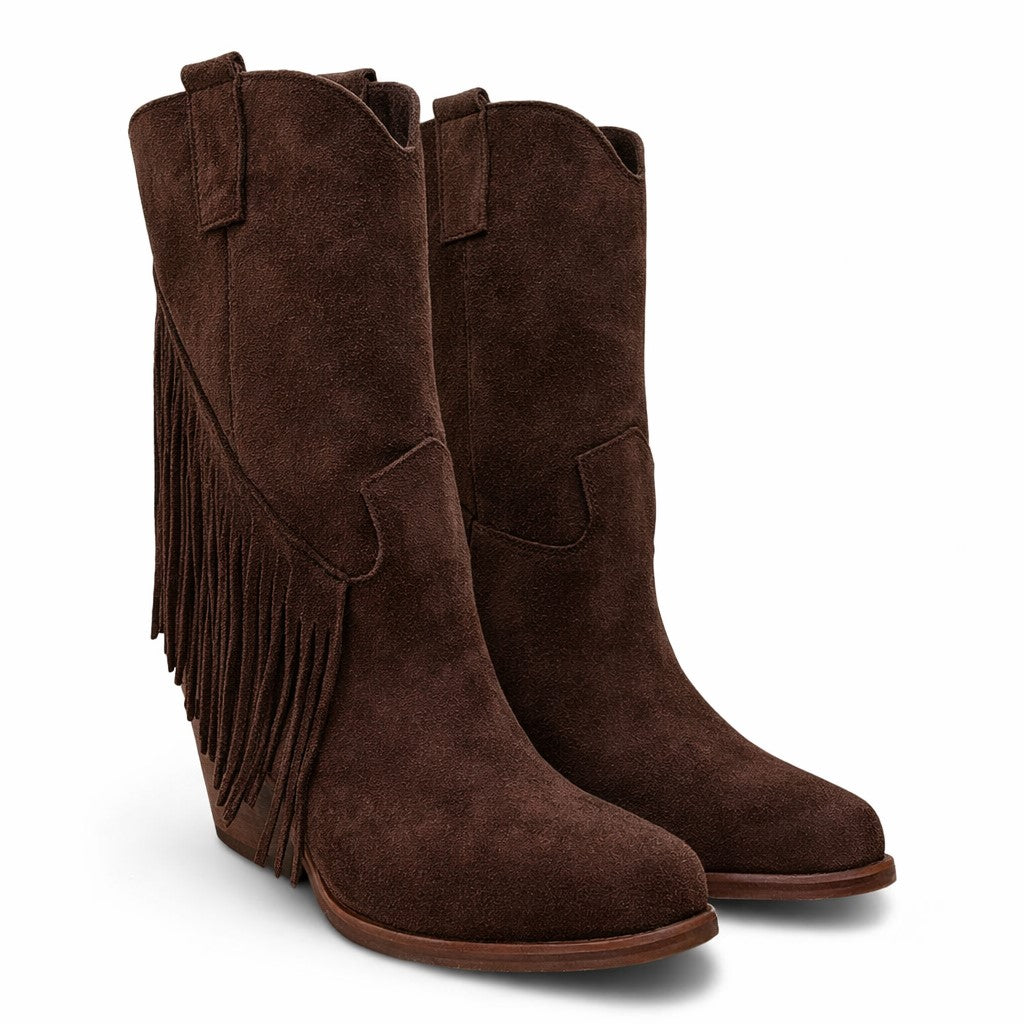Il modello Montana è realizzato in morbido camoscio color cioccolato e si distingue per le lunghe frange laterali, che donano movimento e carattere alla silhouette. Un dettaglio scenografico che richiama l’estetica western più autentica, reinterpretata in chiave femminile e moderna.