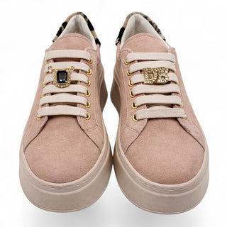 Sneakers con suola platform dal design contemporaneo. La suola, alta 5 cm nella parte posteriore, offre comfort e slancio alla figura. Soletta interna estraibile. Ogni modello è arricchito da accessori gioiello applicati sui lacci, che donano un tocco di eleganza e unicità.
