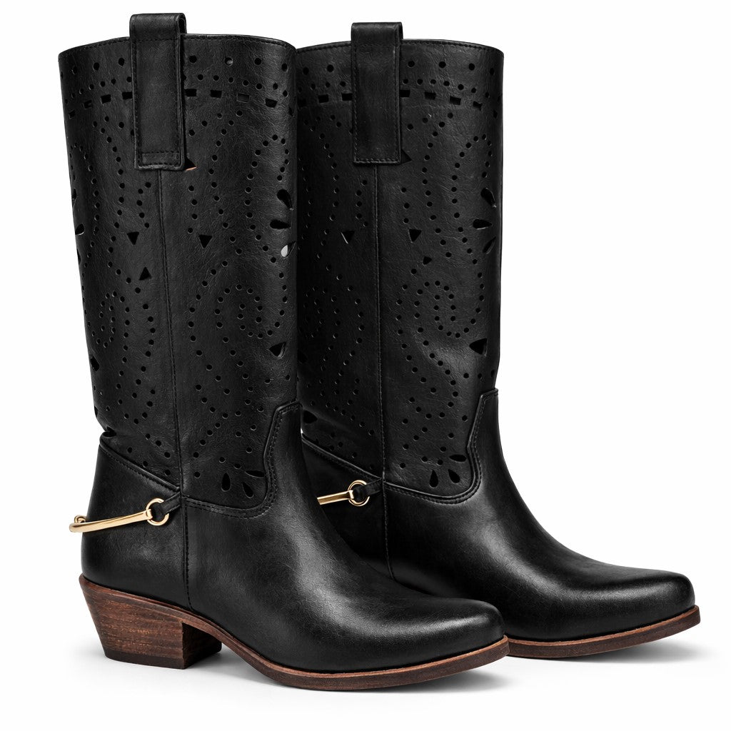 Il modello Georgia è realizzato in morbida pelle color nero e si distingue per la raffinata lavorazione traforata decorativa sul gambale, che crea un disegno armonioso e leggero. Un dettaglio elegante che richiama l’estetica dei classici stivali western reinterpretandola in chiave femminile e contemporanea.